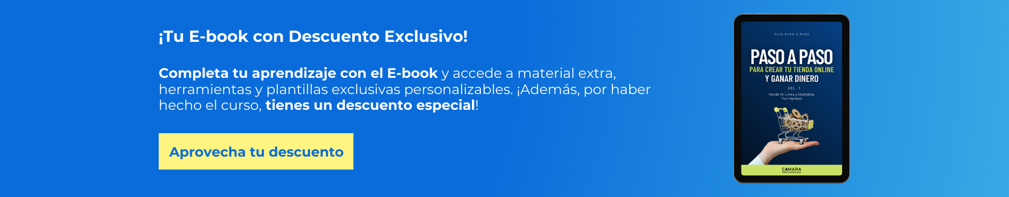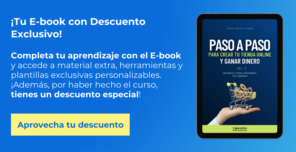 Tendrás toda esta información estructurada y mucho más para complementar lo que aprenderás aquí en nuestro E-book «Paso a Paso para Crear tu Tienda Online y Ganar Dinero». Con este material, podrás aplicar las estrategias aprendidas de manera práctica y efectiva para lanzar tu tienda online con éxito y maximizar tus ganancias. ¡Todo lo que necesitas para dar el siguiente paso en el comercio electrónico está aquí!