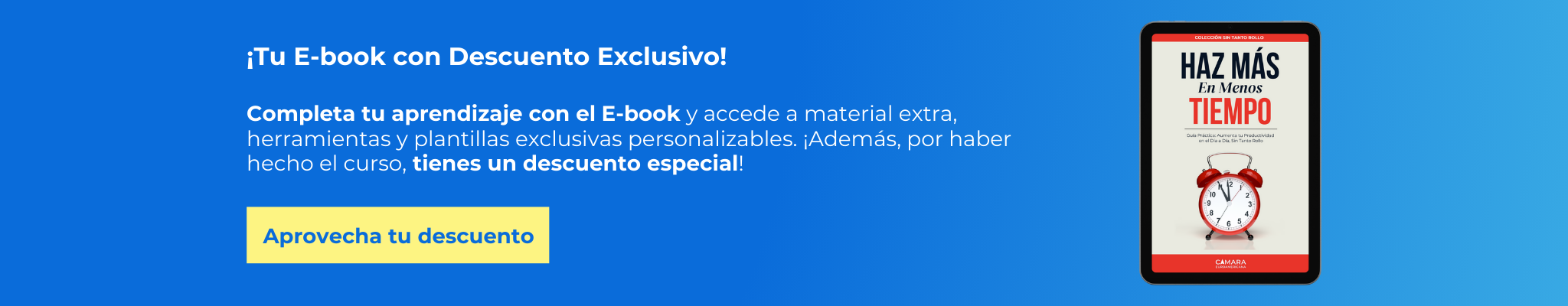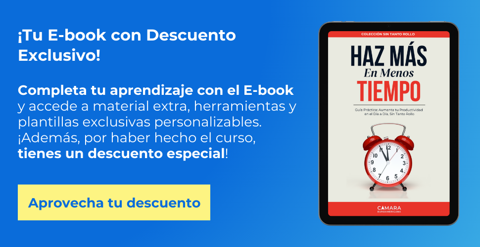 Tendrás toda esta información estructurada y mucho más para complementar lo que aprenderás aquí en nuestro E-book «Haz Más en Menos Tiempo», de la Colección Sin Tanto Rollo. Con este material, podrás aplicar las estrategias aprendidas de manera práctica y efectiva para aumentar tu productividad personal y profesional.